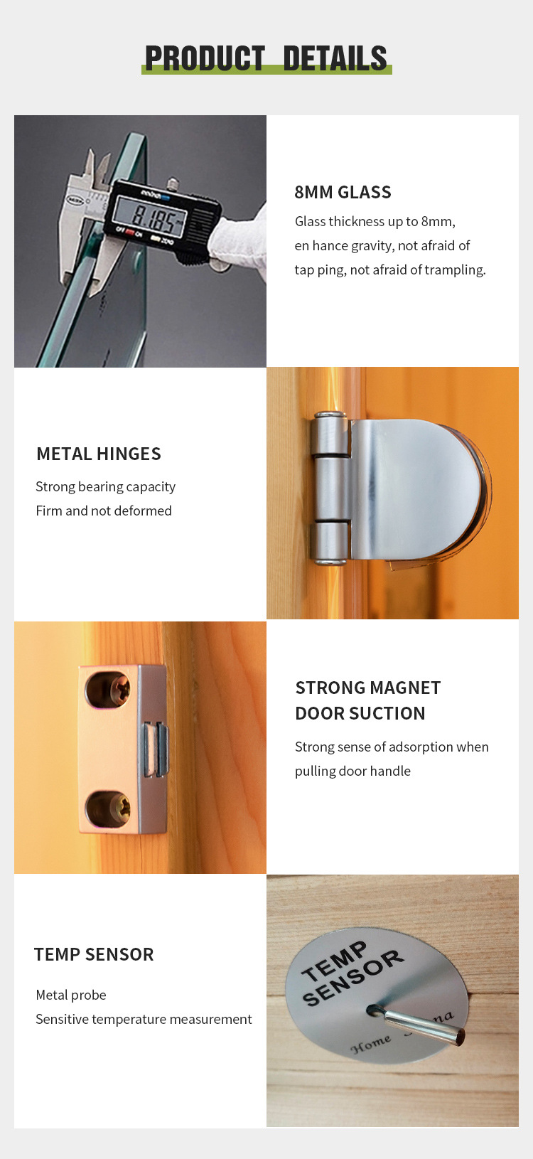 • 8 ملی میٹر غص .ہ والا گلاس: جیسا کہ مصنوع کی تفصیلات میں دکھایا گیا ہے ، 1-3 شخص لکڑی اورکت اور بھاپ سونا کمرے میں 8 ملی میٹر موٹی غص .ہ گلاس ہے۔ یہ کشش ثقل کے خلاف مزاحمت کو بڑھانے کے ساتھ ، غیر معمولی استحکام کا حامل ہے۔ آپ کو ٹیپنگ یا روندنے کے بارے میں فکر کرنے کی ضرورت نہیں ہے - یہ روزانہ استعمال کا مقابلہ کرنے کے لئے بنایا گیا ہے۔