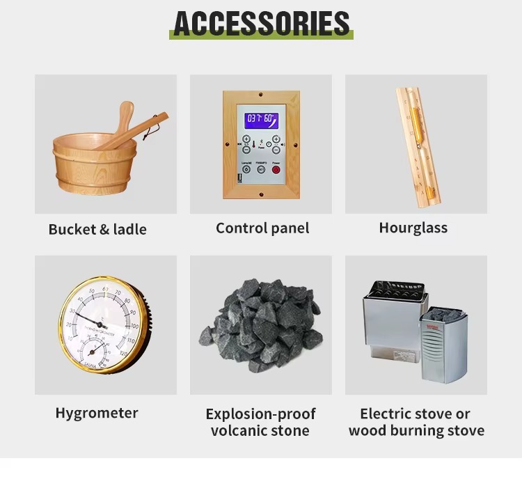 • سونا کے کمرے کو قدرے بلند کرنے کے لئے لکڑی کے معطل اڈے کے ساتھ آتا ہے